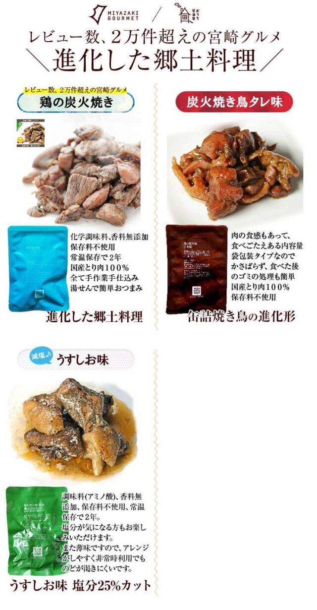 手軽に宮崎を満喫してみませんか? 昭和初期に今のように豊かではなかった時 代に、家庭で飼育されていたニワトリを、お祝い事の際に家族で炭で焼いて食べていたことが始まりではないかと言われています。宮崎では恵まれた自然と温暖な環境から、昔も同様で、卵も取れまた食用 としても活用できるニ ワトリが大変重宝されており、昔はどの農家でも庭先で鶏を飼っており、正月や祭りなど行事が るときには、つぶして刺身、だしなど大切に料理され たデータが残っております。宮崎地方では、今日に至るまで庶民の味として、また宮崎の食文化として親しまれるようになりました。 化学調味料、香料、保存料無添加。 現在食品において高い割合で調味料(アミノ酸等) という表記がされており、多くの加工食品でそれが見られます。また食品の腐敗や変敗の原因となる微 生物の増殖を抑制し、保存性を高めることを目的と した保存料ソルビン酸、ソルビン酸カリウム (ソル ビン酸K)、(Na)など。香りについても香料というもので加工品の香りを高めることを目的としたものが多々あります。それらは加工食品の旨みを引き立て、日持 ちを長くし、メリットも非常に多いと思います。しかし私たちは生産者、製造者の努力、自然界に本来存在する旨みを味わうという賛沢をたまにはしても いいのではないかと考えております。
