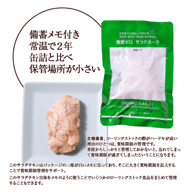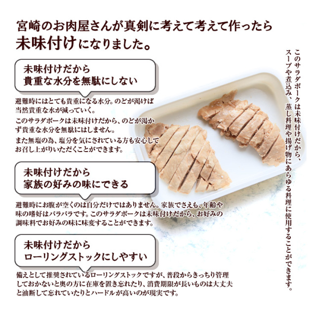 真空レトルト包装で常温保存が可能なサラダポークは、万が一の災害や停電時にも大活躍!
