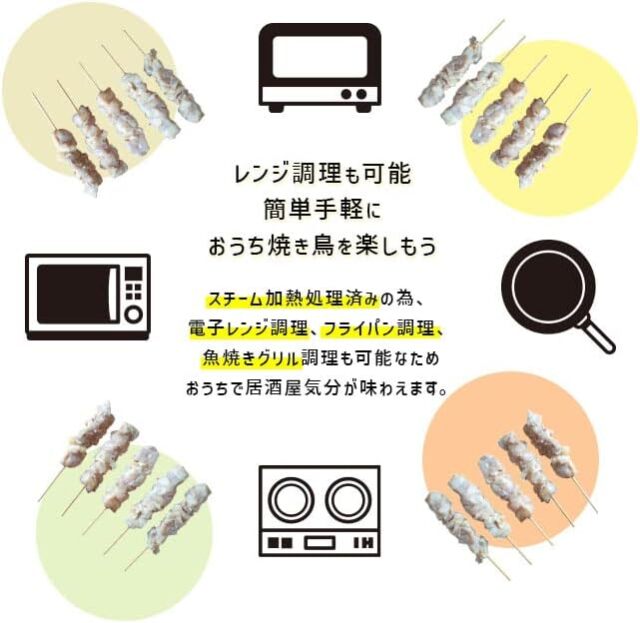 2.加熱済の商品なので、フライパンやホットプレート、電子レンジ、トースターなどで簡単に調理できます。 3.味付けされていないシンプルな商品ですので、タレ、塩、など好みの味付けをしながら焼き目だけ入れていただければオリジナルの焼き鳥が出来上がります。