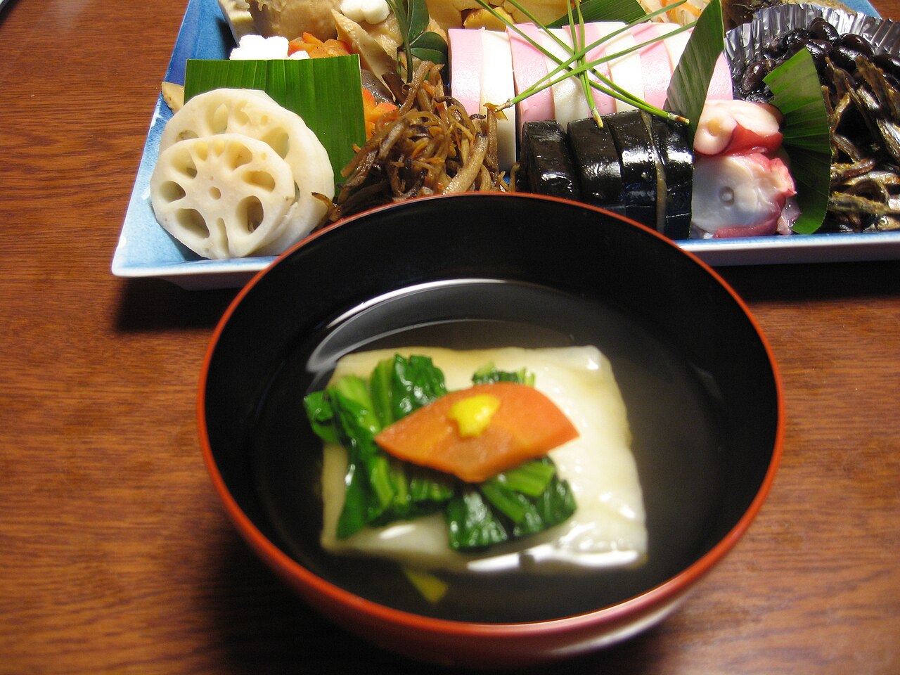 その他、その始まりは平安時代、お祝い事や特別の日とされる「ハレの日」に食べる食べ物として、年神様に供えた餅や里芋、にんじん、大根などを、その年の最初に井戸や川から汲んだ「若水」と、新年最初の火で煮込み、元旦に食べたのが始まりとする説。
