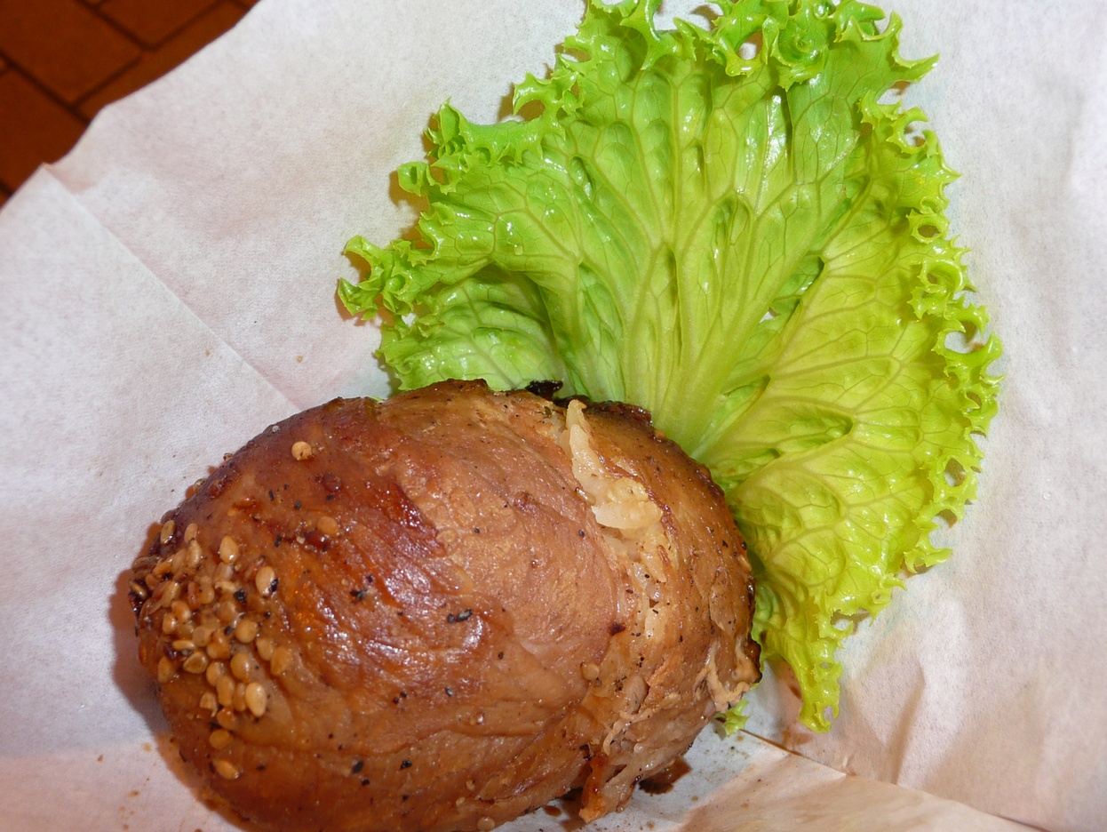 タレに漬け込んだ豚モモ肉の薄切りをご飯に巻いてこんがりと焼き上げる。