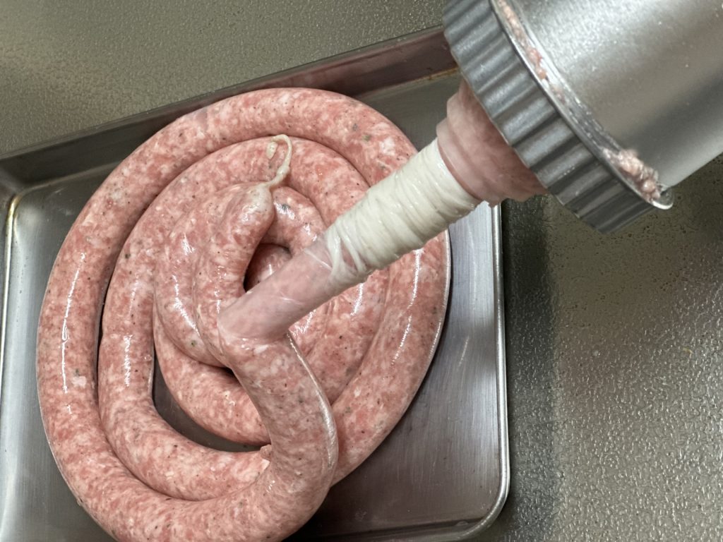 次に、調味したひき肉をケーシングに詰めます。これがいわゆる腸詰めの作業です。ケーシングは天然の羊や豚の腸、または人工のものが使用されます。