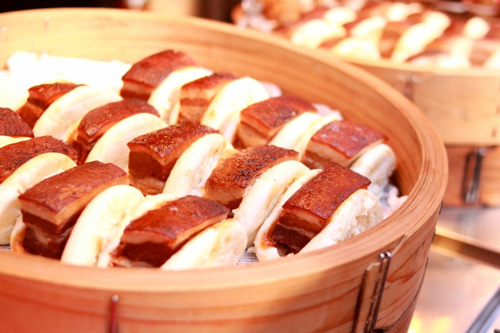 この料理は、柔らかく煮込んだ豚の角煮を小ぶりのふわふわした中華風の蒸しパンで包んだものです。