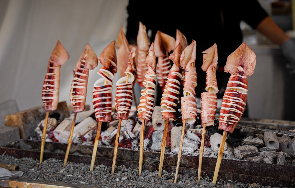 一方、屋台でよく見られるのは「串刺し」スタイルのイカ焼きで、胴体部分と足を焼き、醤油ベースのタレを絡めたシンプルなものが主流です。