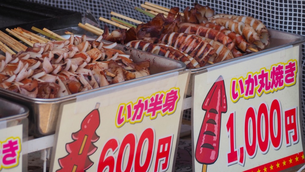 屋台の露店で焼かれるイカ焼きは、醤油やタレが焼ける香りが広がり、通りを歩く人々を自然と引き寄せます。